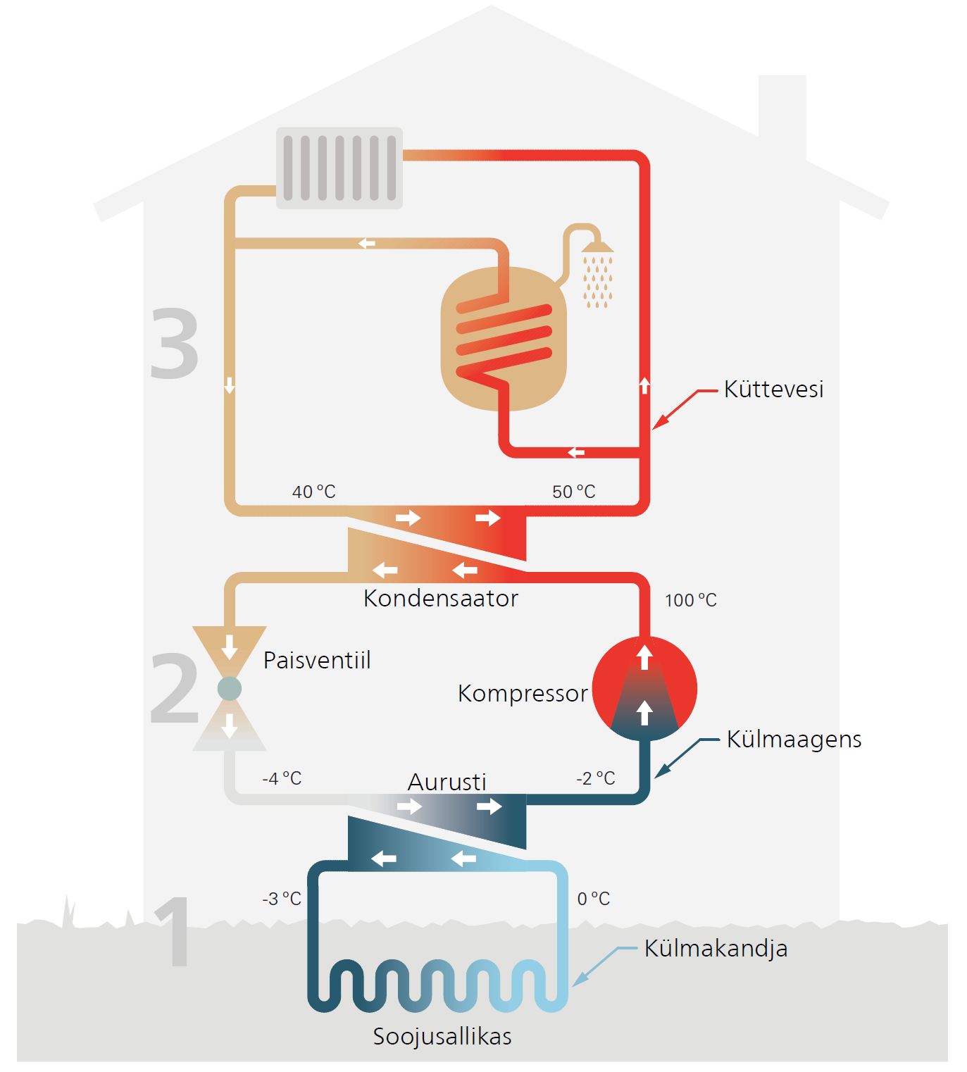 Maakollektori vedelik liigub soojuspumba aurustisse. Siin vabaneb maakollektori vedelik soojusenergiast ja selle temperatuur langeb mõned kraadid. Siis liigub vedelik tagasi soojusallikasse, et omandada uut energiat.