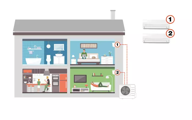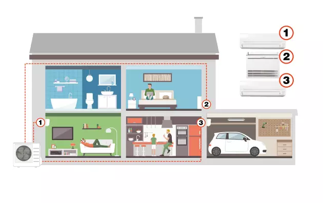 Kui teil on mitu korrust, kelder või sisseehitatud garaaž, saate energiasäästliku kütte või jahutuse saamiseks kasutada sama välisosa kuni viie eraldi siseosaga.