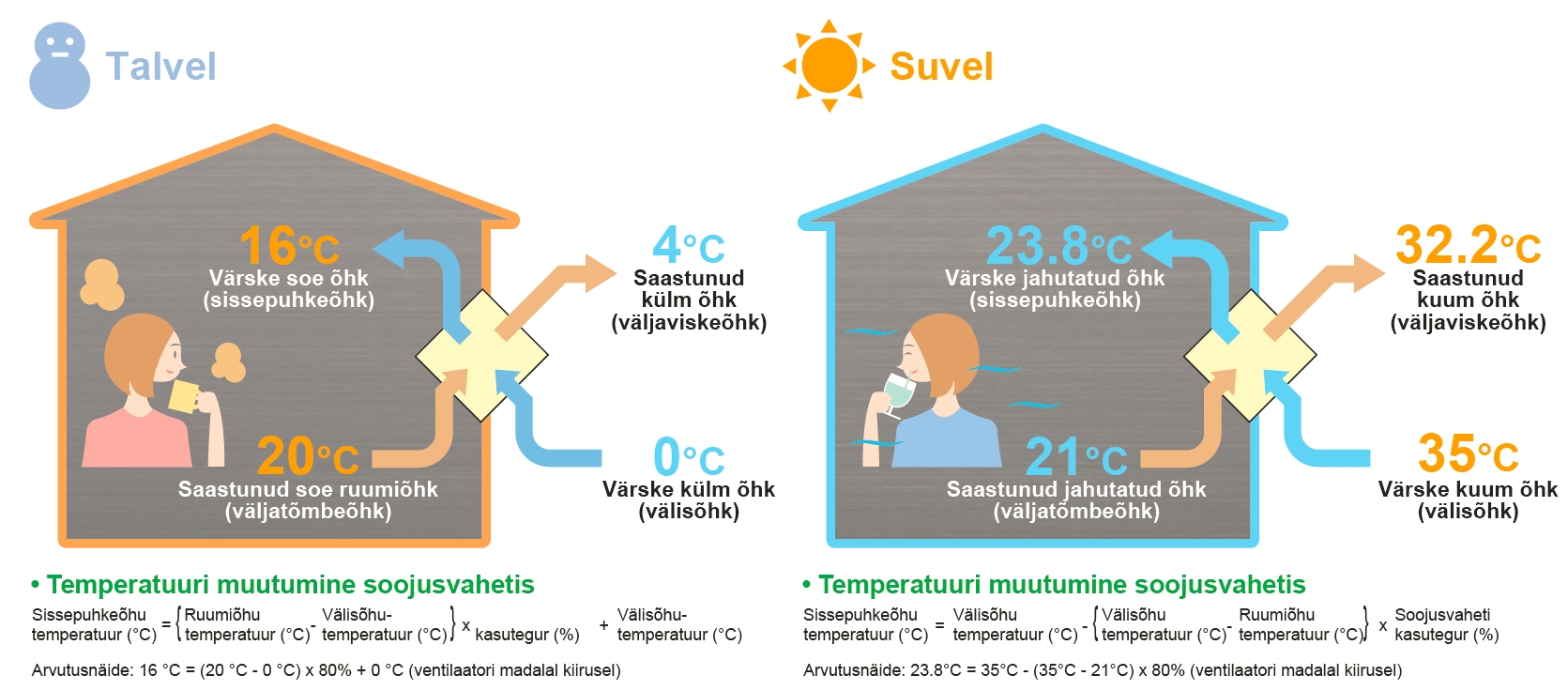 Allpool oleval pildil on kujutatud ventilatsiooniseadme toimimine nii talvel kui suvel (suurema pildi vaatamiseks kliki pildil). Arvutusnäite aluseks on VL-100U5-E, ventilaatori väike kiirus.